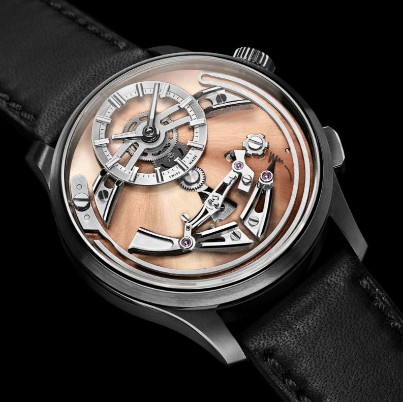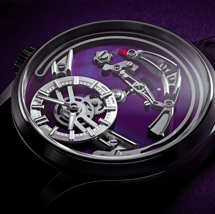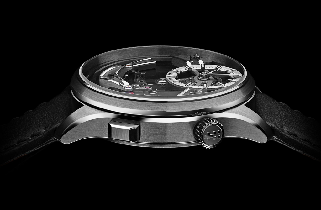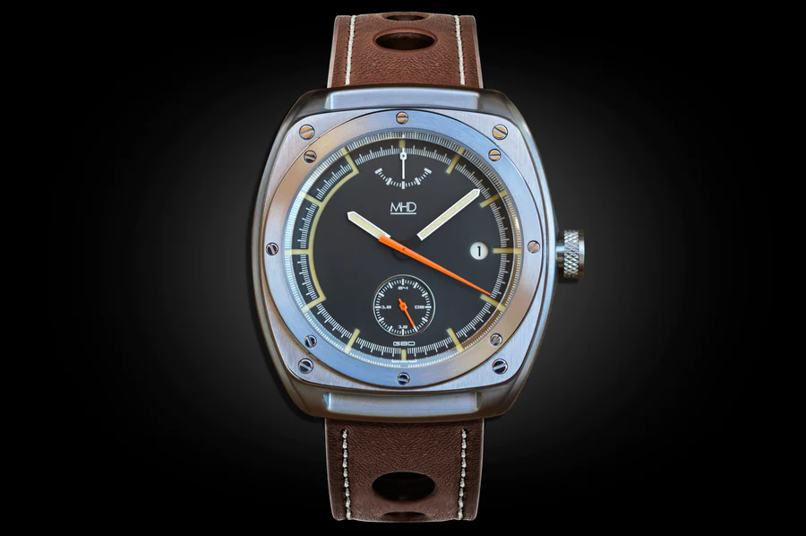 For the SC (Super Car) Humphries took inspiration from Italian car designer Marcello Gandini, famous for designs such as the Lamborghini Countach, giving the watch a unique 1970’s feel. Gandini’s trademark rear wheel arch design has influenced the shape of MHD SC watch chassis case, exposing the knurled, DLC coated barrel case. The sandwich dial has laser cut holes to show the vintage-style lume beneath.