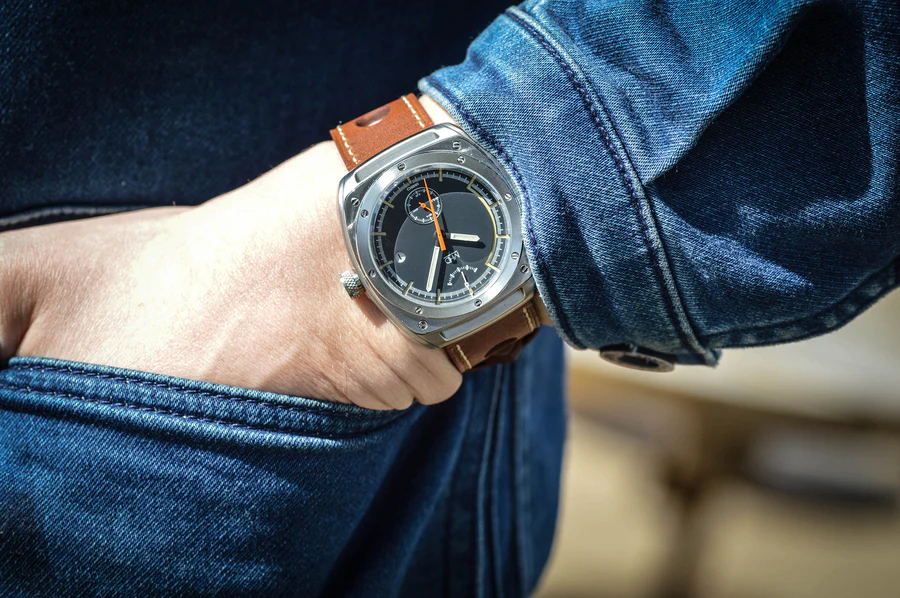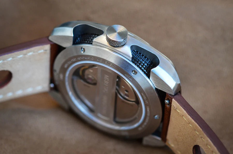 For the SC (Super Car) Humphries took inspiration from Italian car designer Marcello Gandini, famous for designs such as the Lamborghini Countach, giving the watch a unique 1970’s feel. Gandini’s trademark rear wheel arch design has influenced the shape of MHD SC watch chassis case, exposing the knurled, DLC coated barrel case.