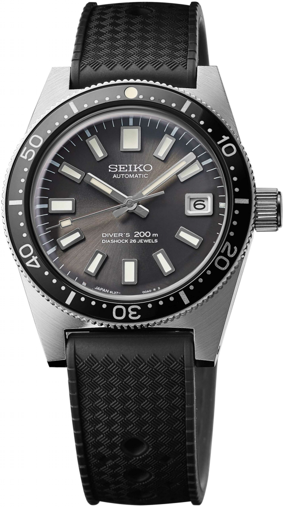 Just like the case, the dial of the SJE093 pays homage to the original 1965 62MAS, with some modifications to showcase its upgraded features. The new SJE093 replicates the original’s dark grey sunburst surface, oversized rectangular hour markers, baton-style hands, and 3 o’clock date window. Modern Seiko Lumibrite is used for illumination, offering superior visibility in dim conditions. The text at the dial’s bottom half has been revised to show the boosted depth rating and an increased count of jewels in the newly employed Caliber 6L37 movement that drives the watch.